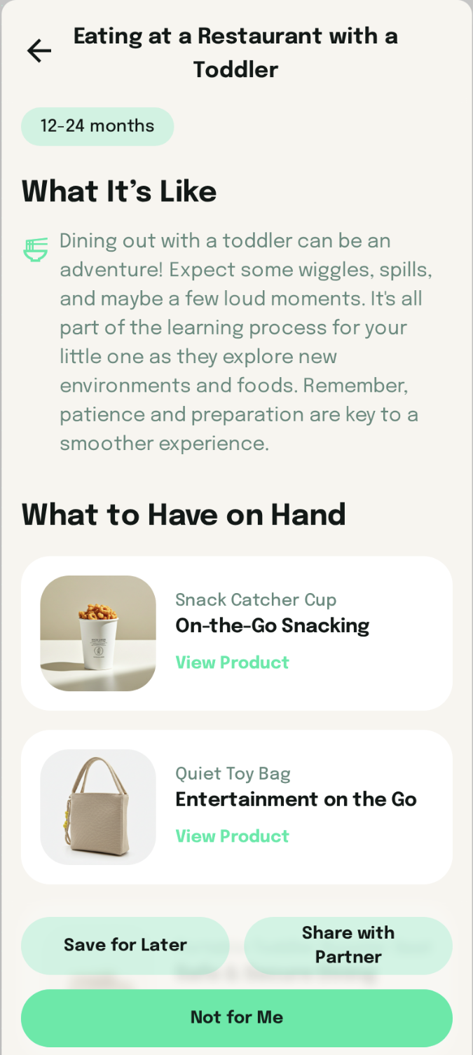 “Instead of showing you hundred of items to buy, we help you understand your new routines — feeding at 2am, heading to the first doctor visit, eating at a restaurant with a baby — and guide you to what actually fits your life, not someone else’s list.”